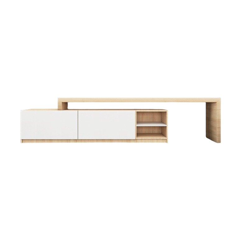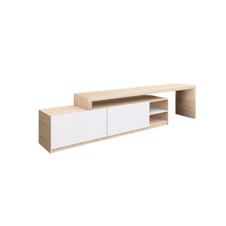 Su estructura está hecha de melamina 15 mm en diseño roble americano y blanco frosty, para mayor soporte y estabilidad. Cuenta con dos espacios cerrados, cubiertas por dos puertas de cierre lento. A lado está un módulo con un entrepaño y finalmente un espacio abierto.